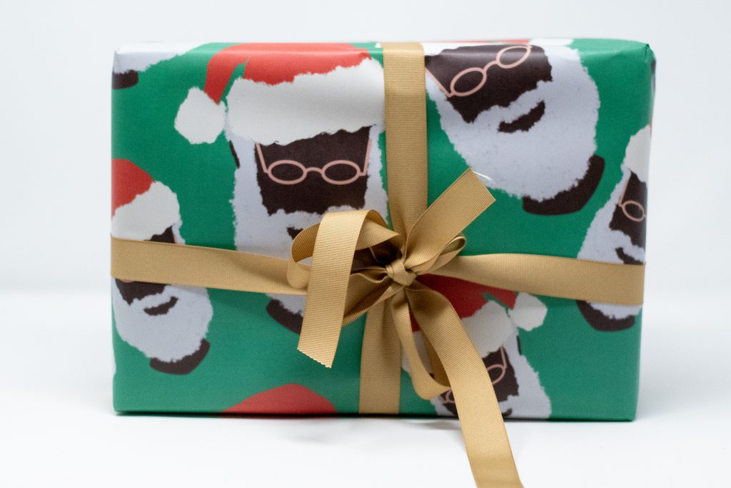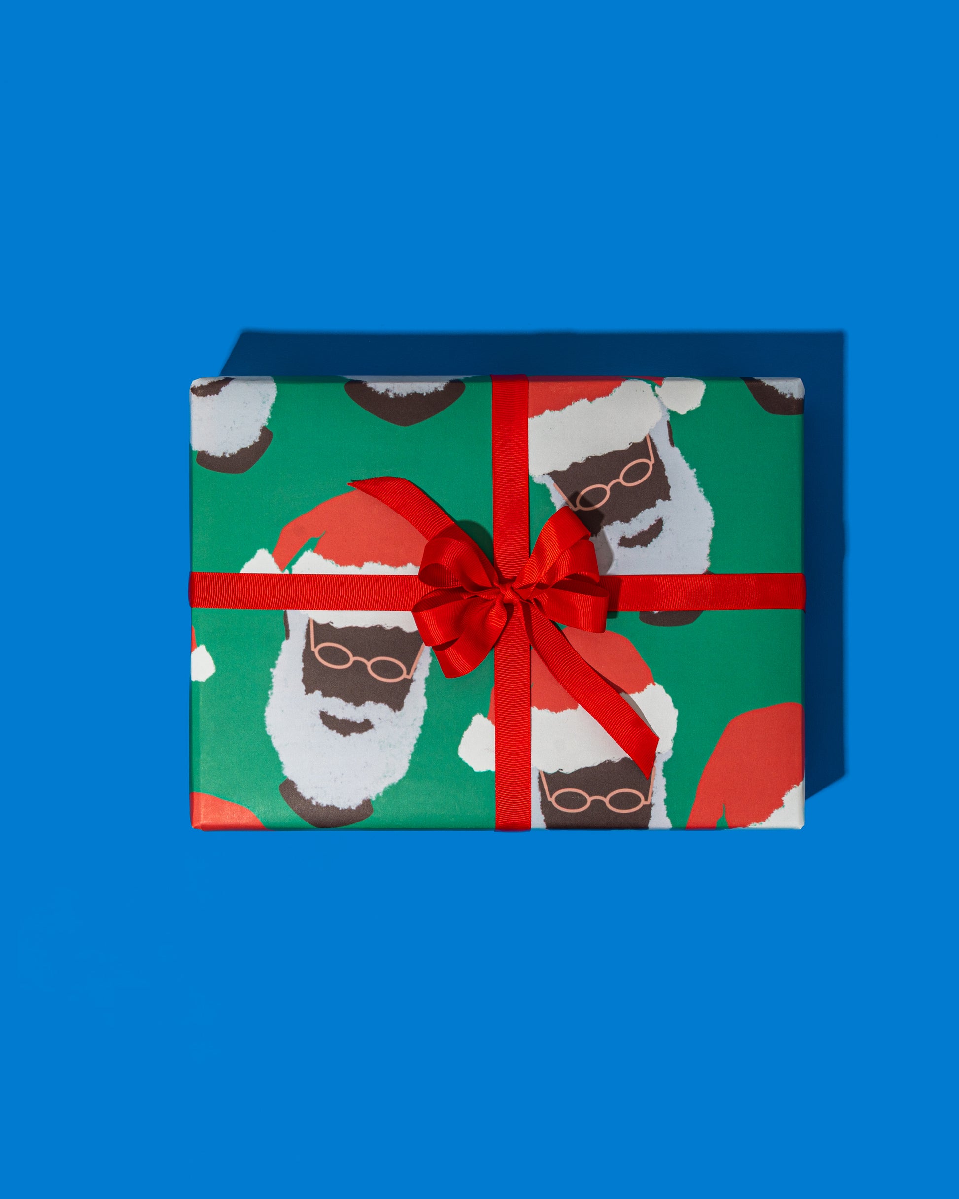 Not your typical Santa Claus. Black Santa ready to wrap your gifts for the holiday season.