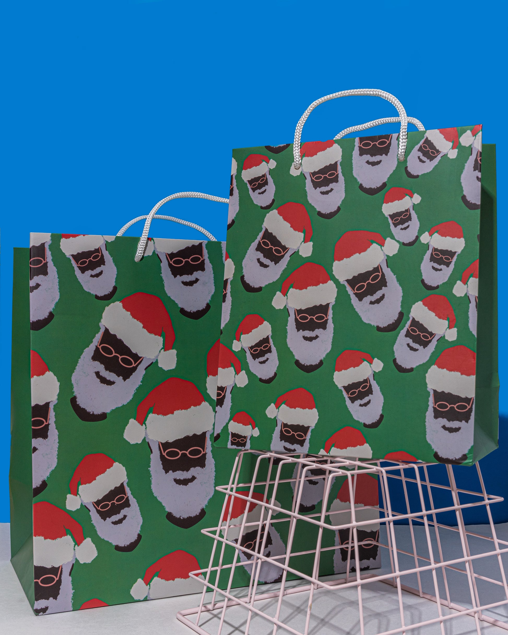 Not your typical Santa Claus. Black Santa ready to wrap your gifts for the holiday season.
