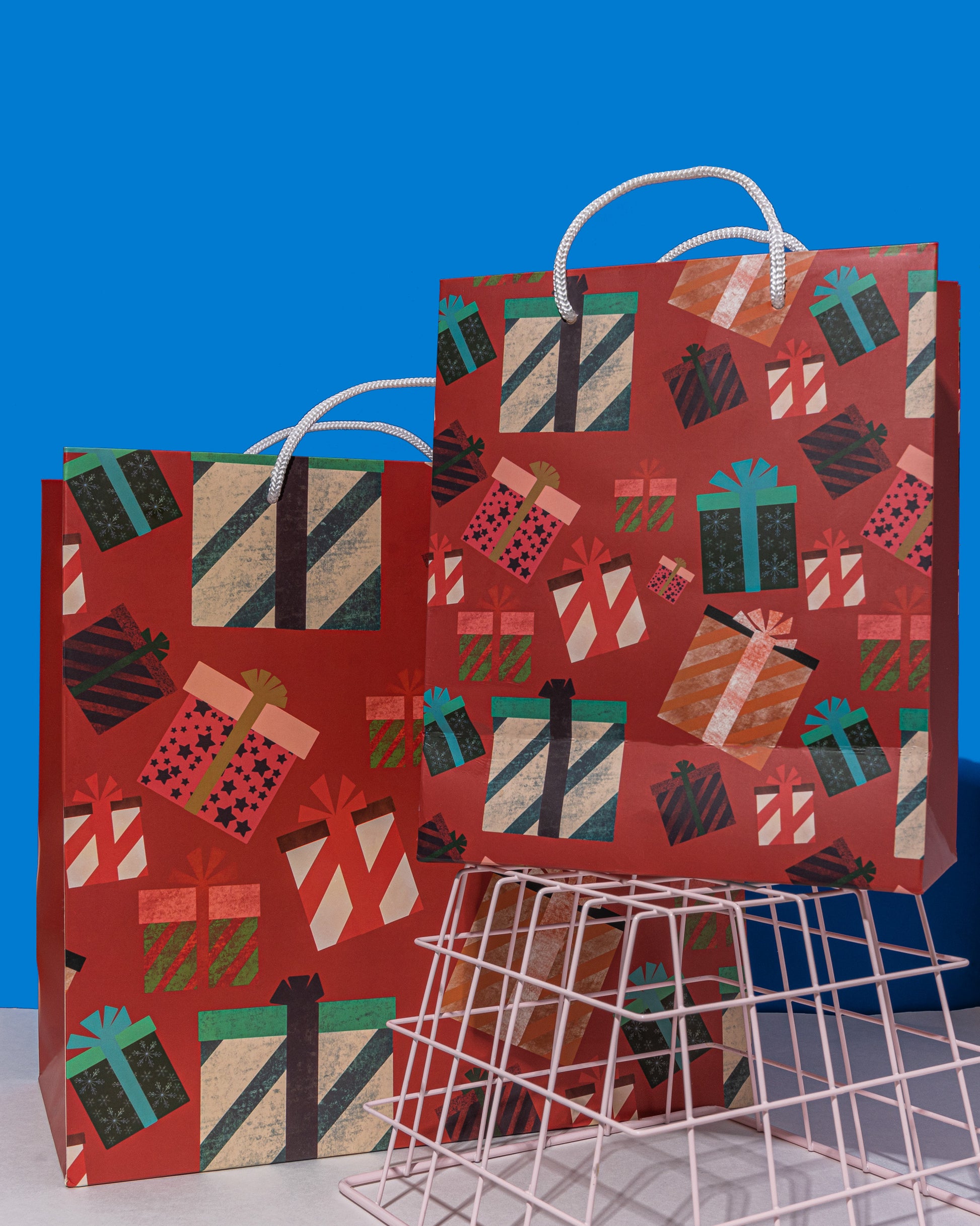 This festive prnt has presents all wrapped up in white, yellow, and green on red paper. Perfect for the holidays.