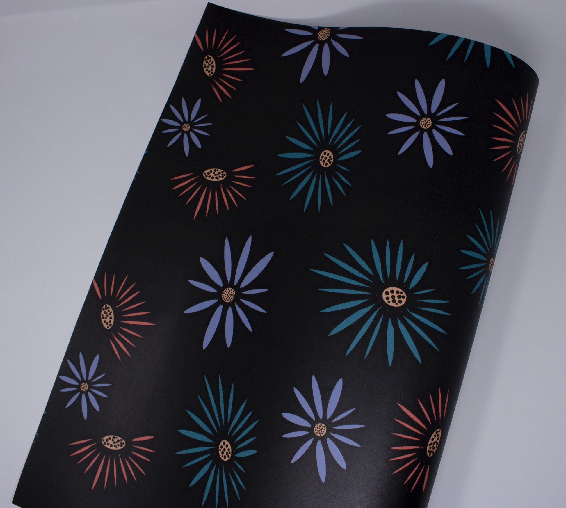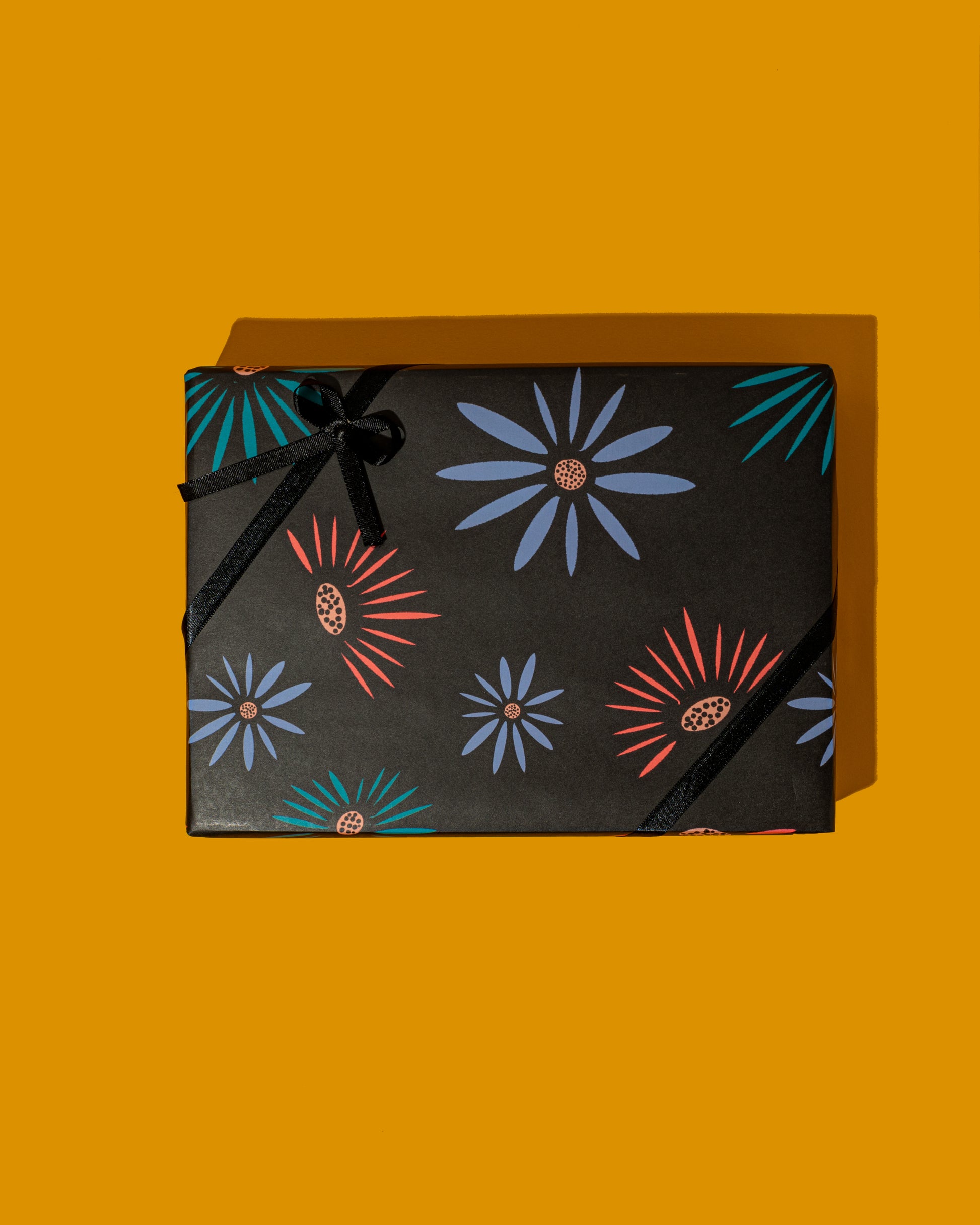 A modern floral print with a black background makes this a perfect wrap for any gift.